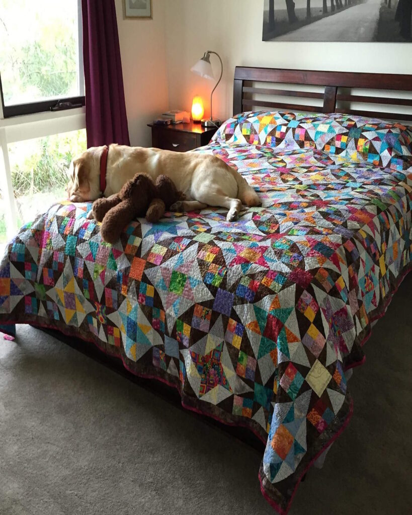 This quilt was a gift for family friends. Fabrics were chosen with thought towards their personality and aesthetic. It was freehand quilted in an all-over pattern using a complementary thread. Dexter approves.