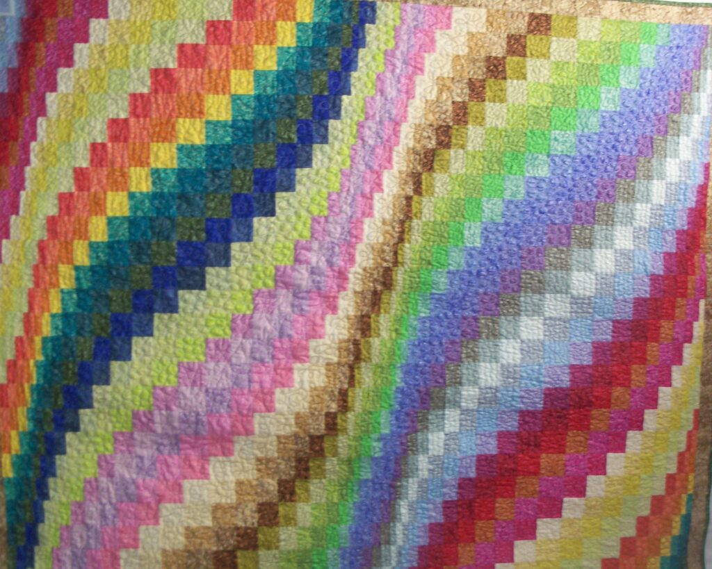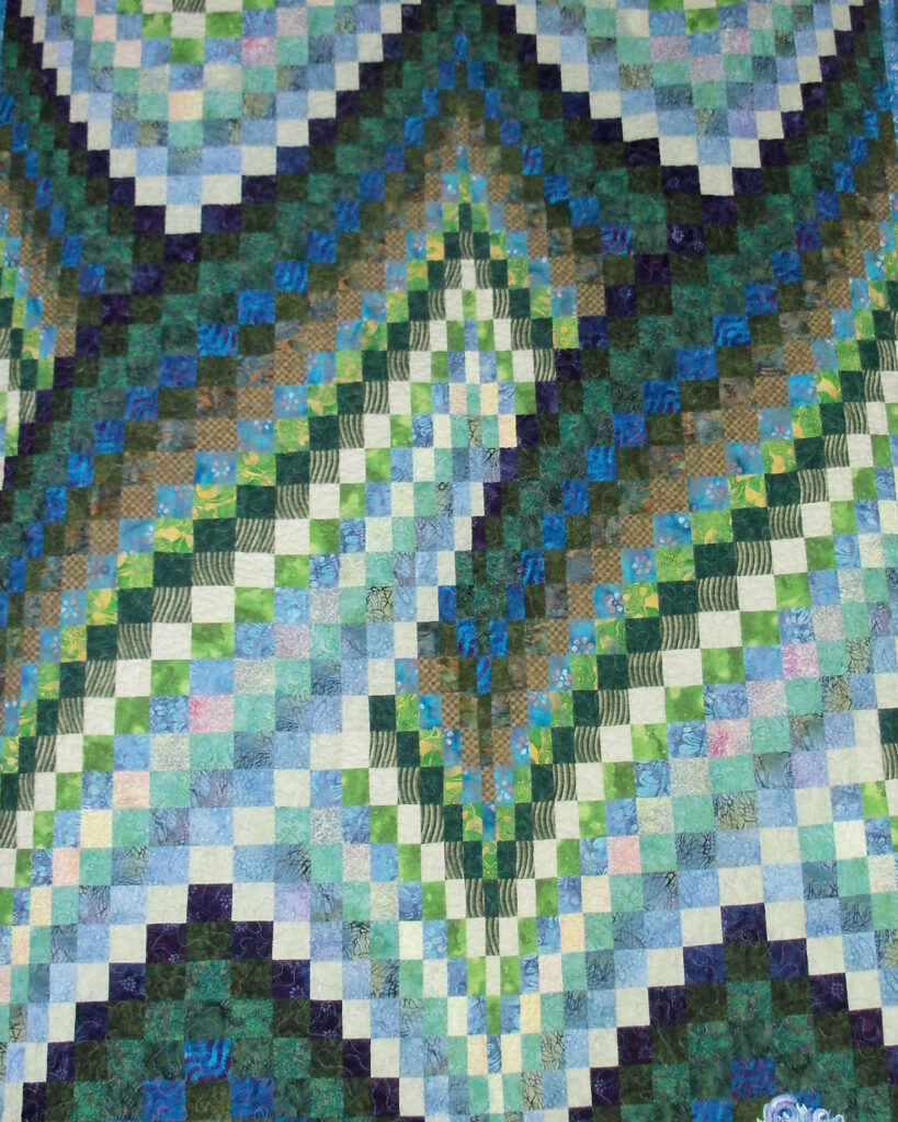Using a pattern from Eileen Wright’s Twist-and-Turn Bargello Quilts book, the fabrics for this quilt were selected by the quilt’s commissioner. This piece was freehand longarm quilted in an all-over pattern using a complementary variegated thread.