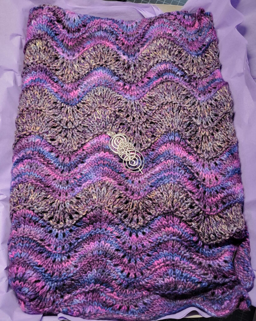 This shawl was commissioned as a custom dye order to draw colors from a favorite painting. It was made with a blend of wool, silk, alpaca, and linen.