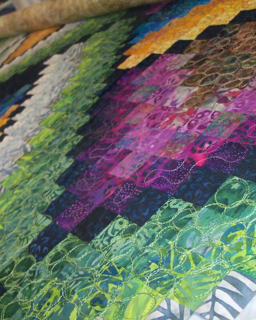 This quilt was made in a hand-selected ssortment of batik fabrics from Portsmouth Fabric Co. The quilt was freehand longarm quilted using a different